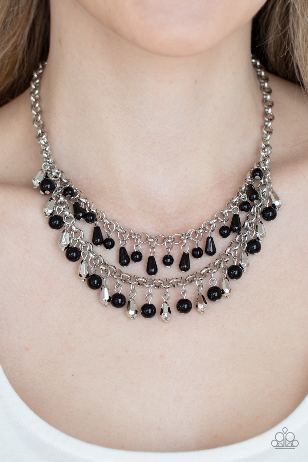 A glamorous collection of bubbly black beads, faceted silver beads, and shiny black teardrop beads alternate along two strands of chunky silver chains, creating a flirtatious fringe below the collar. Features an adjustable clasp closure.