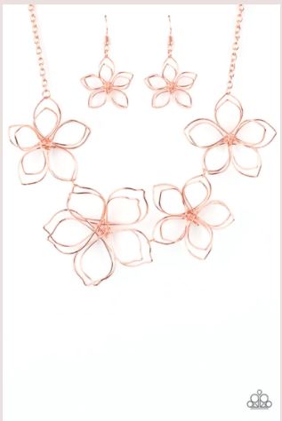 Shiny copper wire delicately twists into oversized blossoms. Varying in size, the airy floral frames delicately link into an asymmetrical display as the layered frames elegantly pop beneath the collar. Features an adjustable clasp closure.