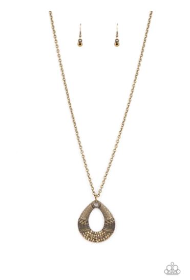 Studded and embossed in bands of texture, the bottom of a hammered brass teardrop is encrusted in golden topaz rhinestones, creating a glitzy pendant at the bottom of a lengthened brass chain.