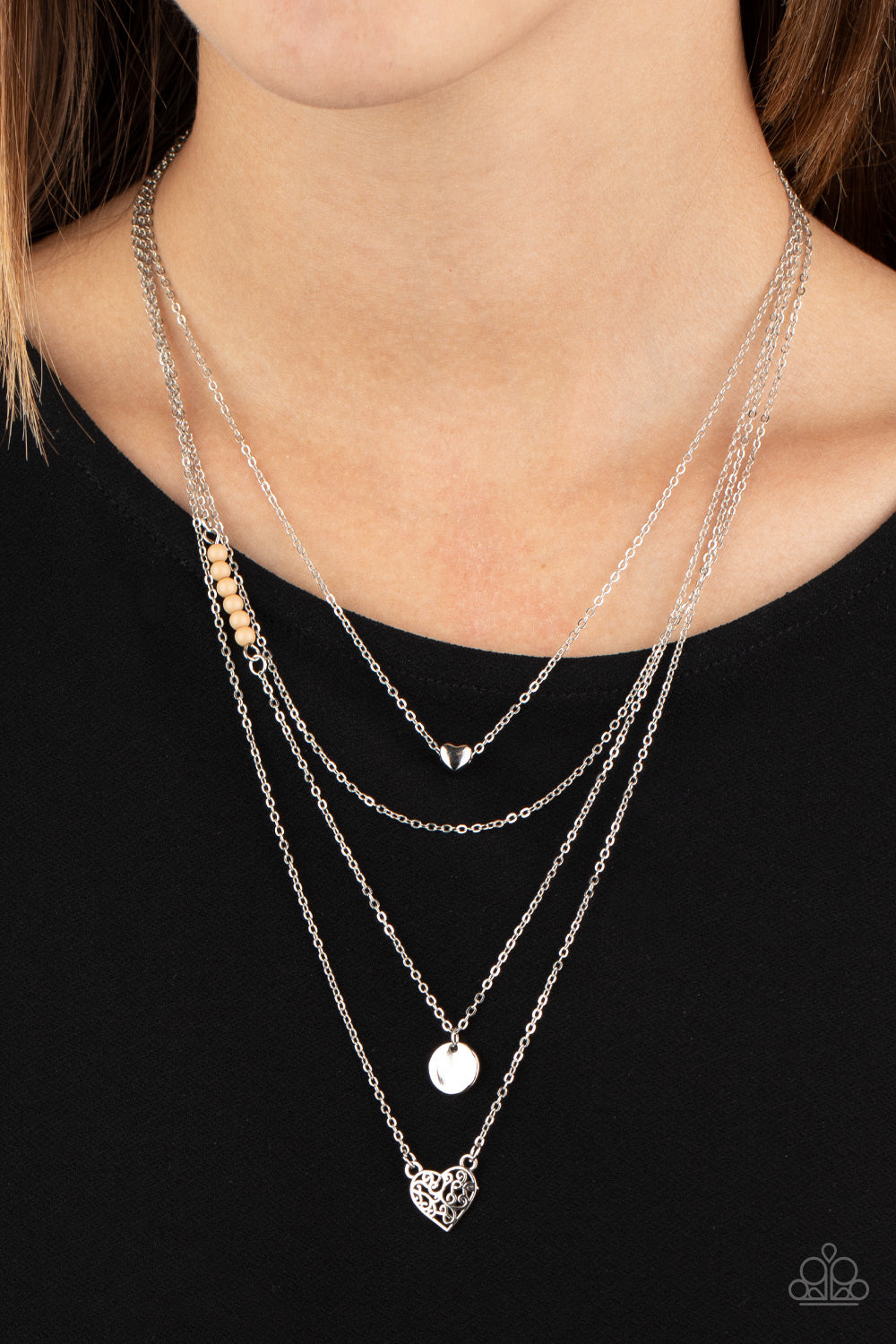 Shimmery silver layers cascade below the collar. Infused with hints of brown beading, dainty silver hearts and a delicately hammered silver disc swing from the bottoms of the chains for a whimsical finish. Features an adjustable clasp closure.