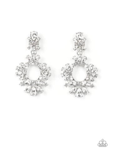 Ablaze with a mismatched assortment of brilliant white rhinestones, a stunning wreath swings from the bottom of a dainty white rhinestone fitting for a jaw-dropping dazzle. Earring attaches to a standard post fitting.