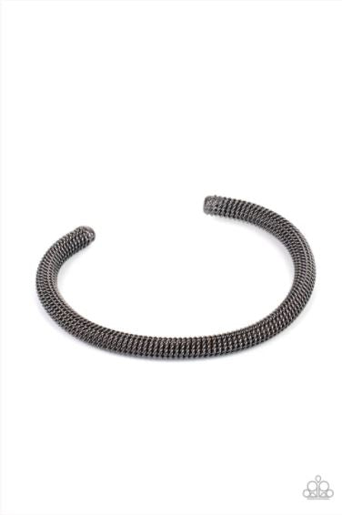 A dainty row of glistening gunmetal chain twists around a gunmetal cuff, creating an edgy industrial display around the wrist.