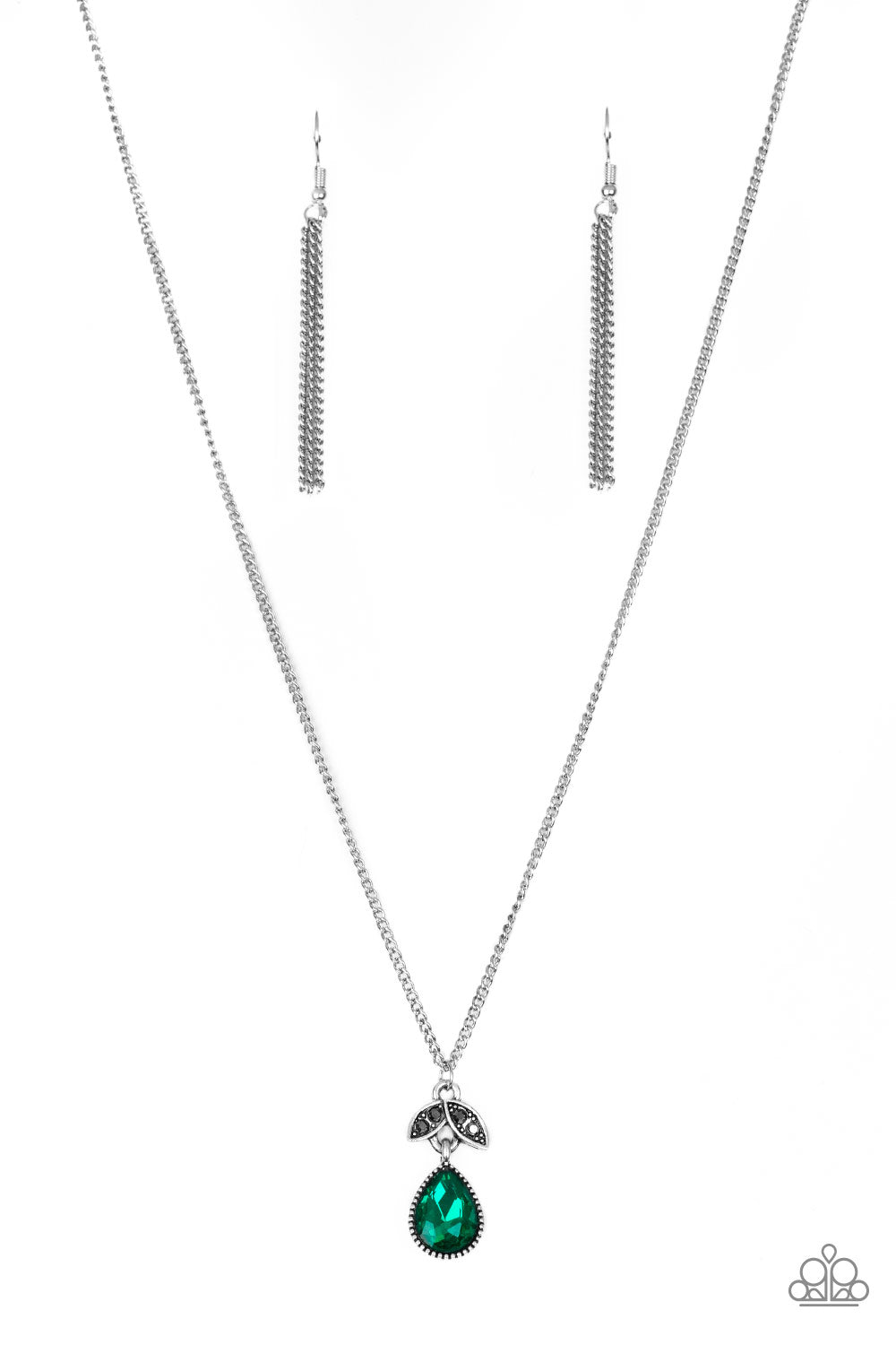 Encrusted in glittery hematite rhinestones, leafy silver frames give way to a green teardrop gem, creating a glamorous pendant below the collar. Features an adjustable clasp closure.