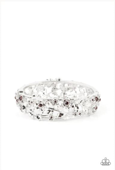 Dotted with dainty purple rhinestone centers, flowering leafy silver vines bloom into two oversized silver frames that delicately hinge into a versatile bangle-like bracelet. Features a hinged closure.