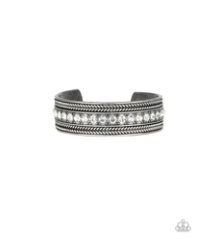 A row of glittery white rhinestones line the center of a studded silver cuff for an edgy look.