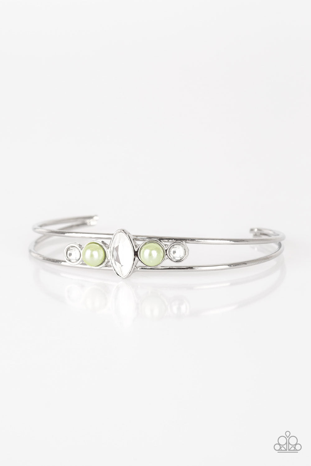 Varying in shape and shimmer, glittery white rhinestones and pearly green beads are encrusted along the top of a dainty silver cuff for a refined look.