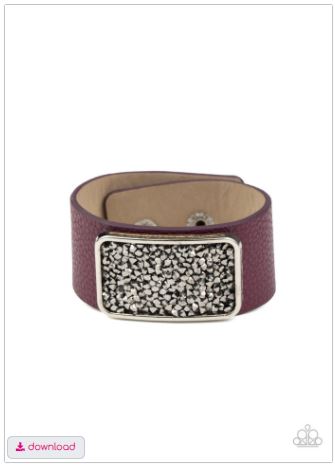A collision of smoky and hematite rhinestones collect inside a silver rectangular frame that is studded in place in the center of a thick plum leather band, creating a sparkling statement piece around the wrist. Features an adjustable snap closure.