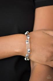 Dainty metallic blue crystal-like beads and shimmery silver accents alternate along a coiled wire to create a refined infinity wrap style bracelet.