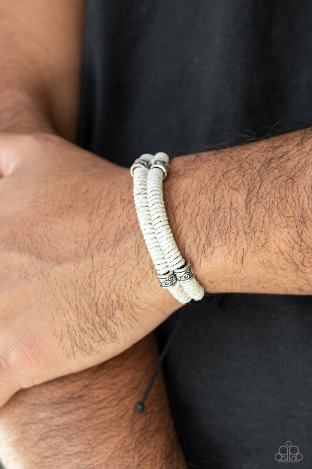 Infused with decorative silver beads, white twine-like cording knots around two shiny black leather cords around the wrist for a seasonal flair. Features an adjustable sliding knot closure.