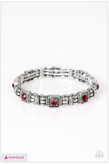 Infused with fiery red rhinestone centers, ornate silver frames are threaded along stretchy bands, creating a refined look around the wrist.