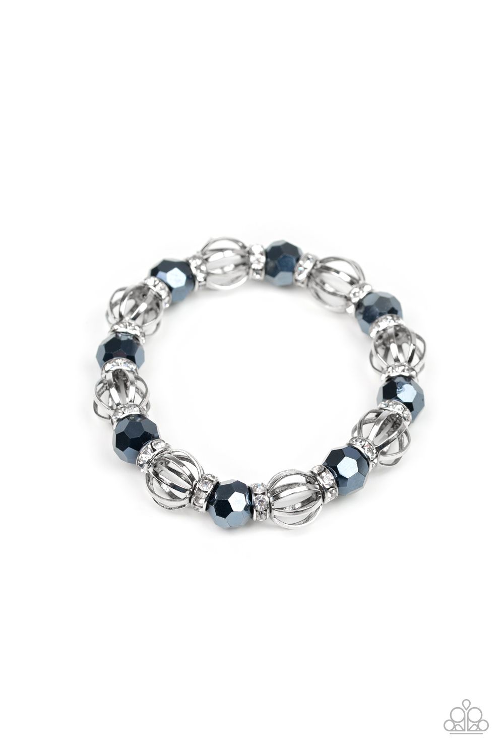 A collection of airy silver beads, faceted blue metallic beads, and white rhinestone encrusted rings are threaded along a stretchy band around the wrist for a glamorous look.