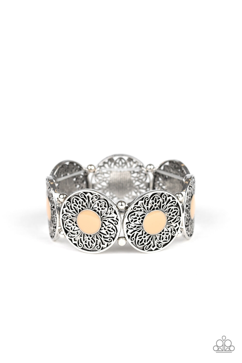 Frilly silver petals bloom from a painted brown center, creating a colorful flower. Infused with dainty silver beads, the shiny flower frames are threaded along stretchy bands around the wrist for a whimsical look.