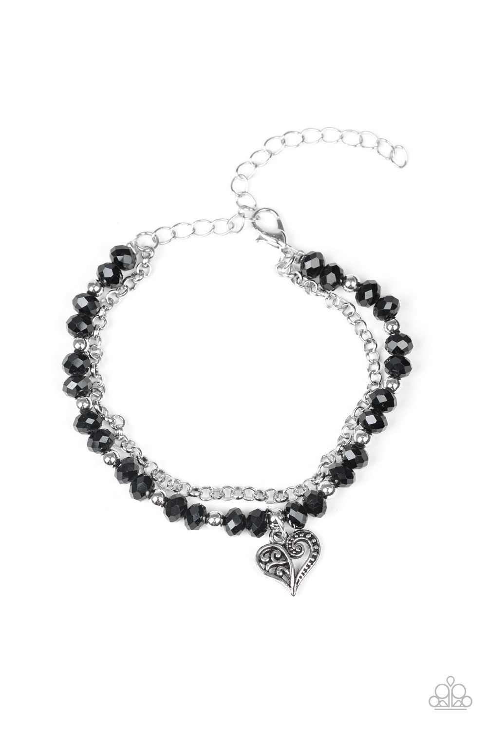 Dainty silver beads join a collection of black crystal-like beads around the wrist. Infused with a dainty silver chain, an ornate silver heart charm swings from the beaded strand for a romantic finish. Features an adjustable clasp closure.