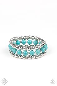 A collection of smooth turquoise stones and shiny silver beads are threaded along stretchy bands, creating earthy layers that adorn the wrist.