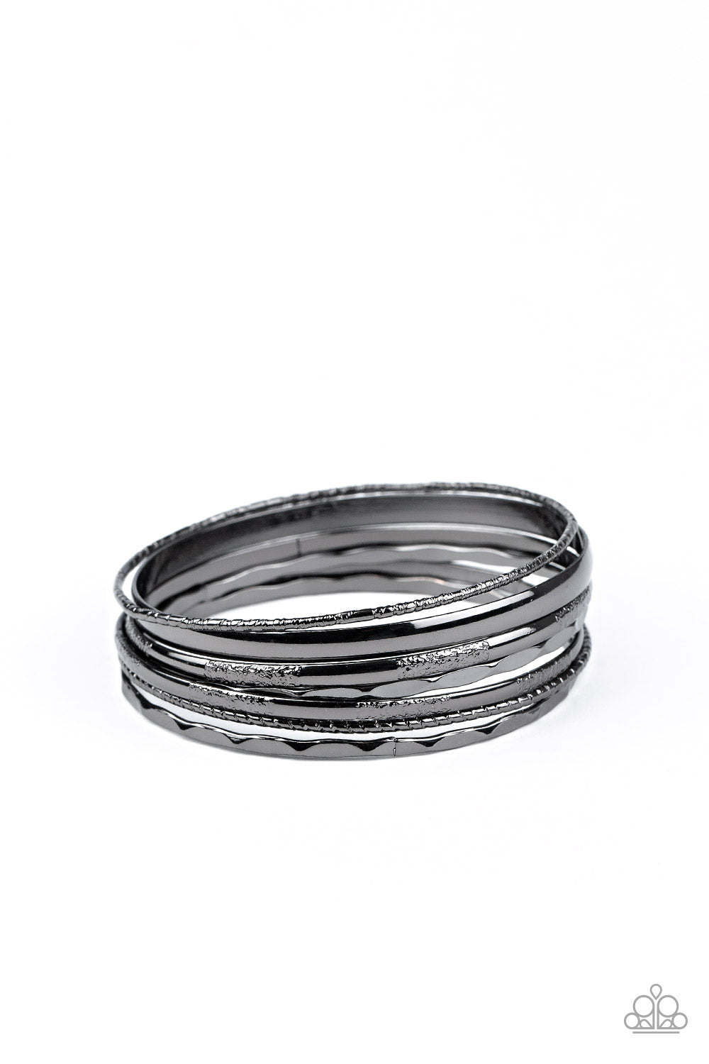 Featuring an array of smooth, hammered, and metallic rope-like textures, a mismatched collection of gunmetal bangles stacks across the wrist for a classic look.