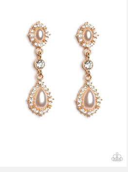 A solitaire white rhinestone is linked between two pearly and white rhinestone encrusted frames, creating an elegant lure. Earring attaches to a standard post fitting.