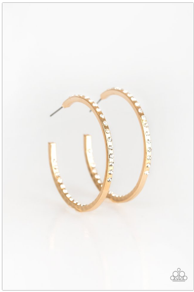 The front half and inner backside of a sleek gold hoop is encrusted in glassy white rhinestones, easily catching and reflecting the light for an extra dash of shimmer. Earring attaches to a standard post fitting. Hoop measures approximately 2" in diameter.