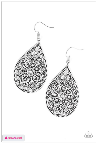 Featuring an elegant filigree filled backdrop, a shimmery silver teardrop swings from the ear. Dainty white rhinestones are sprinkled across the frame for a glamorous finish. Earring attaches to a standard fishhook fitting.