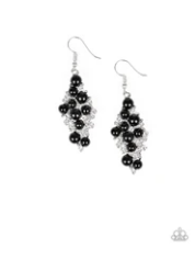 Shiny black beads, dainty silver studs, and radiant white rhinestones coalesce into an elegant lure. Earring attaches to a standard fishhook fitting.