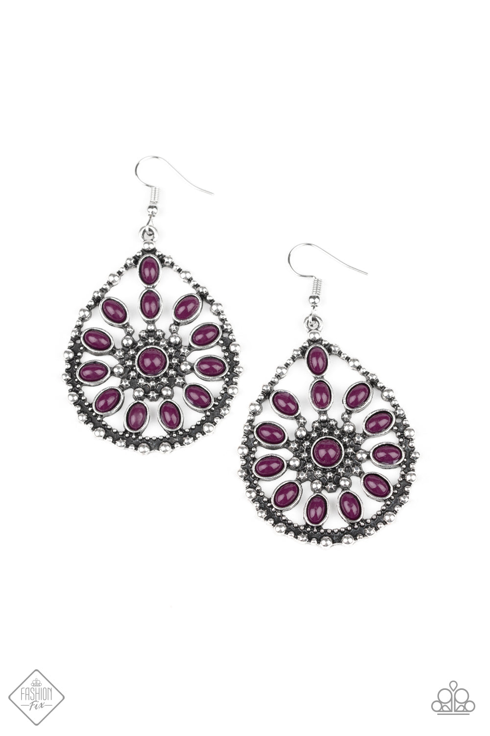 Shiny plum beads gather into a floral pattern that lays among swirls of silver filigree inside a silver teardrop, creating a whimsical frame. Earring attaches to a standard fishhook fitting.