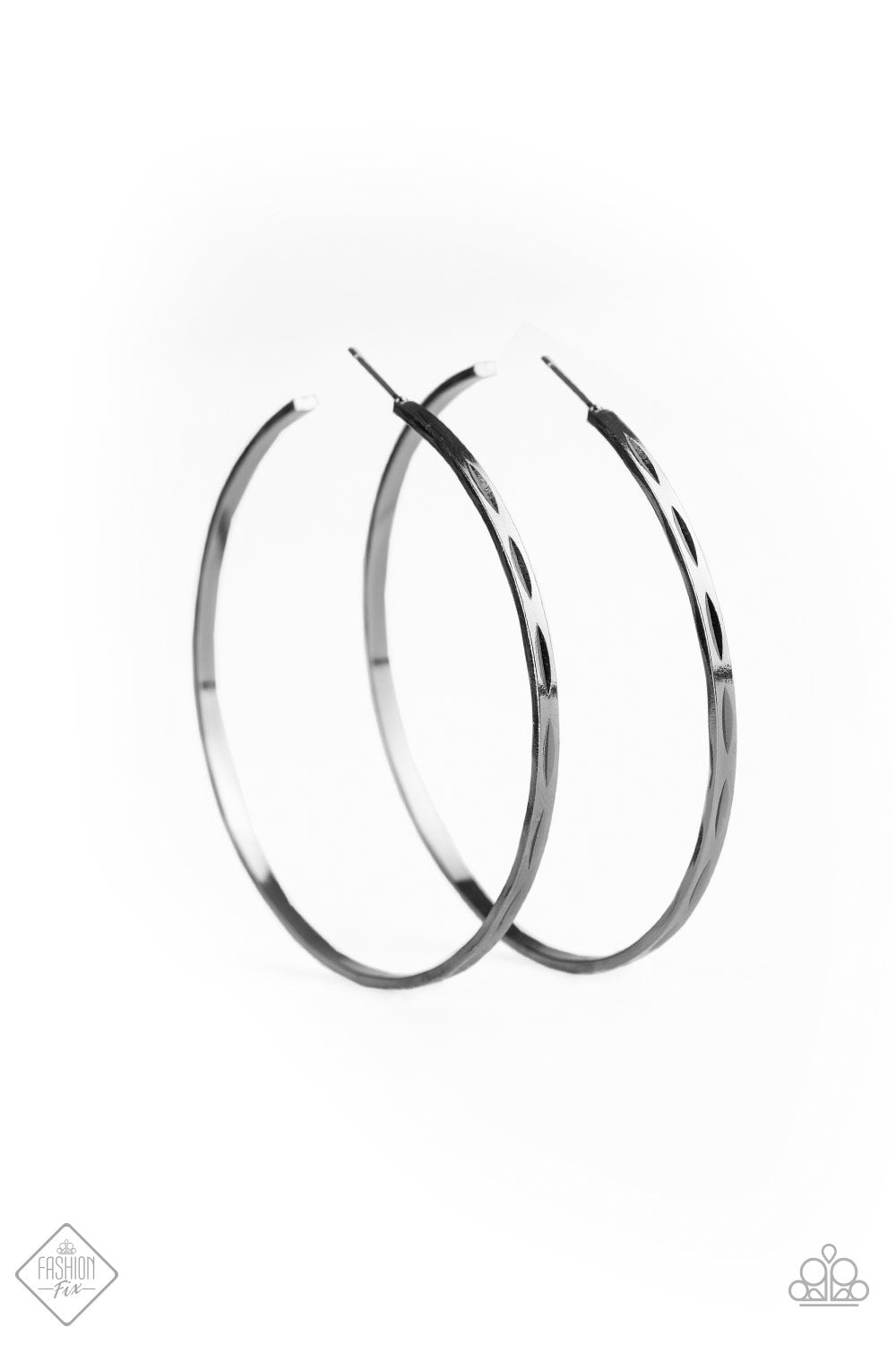 Featuring a high-sheen gunmetal finish, a skinny oversized hoop is stamped in a faceted texture for an edgy look. Earring attaches to a post fitting. Hoop measures approximately 2 3/4" in diameter.