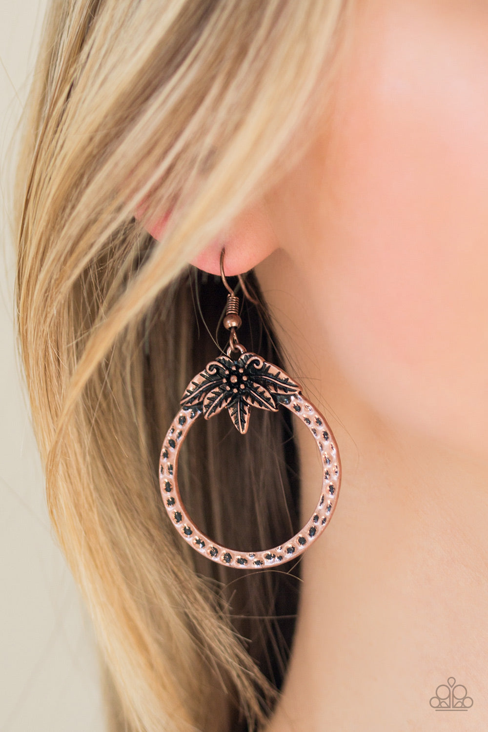 Featuring lifelike details, a flowery frame blooms across the top of a hammered copper hoop for a seasonal look. Earring attaches to a standard fishhook fitting.