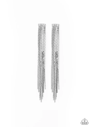 A tassel of flat silver chain cascades from a row of three white rhinestones. Brushed in a high sheen reflective finish, the streaming chains coalesce into a brilliant shimmer. Earring attaches to a standard post fitting.
