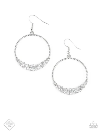 The bottom of a textured silver hoop is encrusted in glittery white rhinestones for a glamorous look. Earring attaches to a standard fishhook fitting.