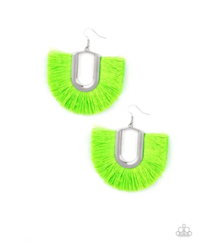 Neon yellow thread fans out from a striking silver fitting, creating a vivacious fringe. Earring attaches to a standard fishhook fitting.