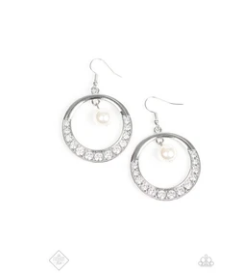 A single white pearl is suspended gracefully from the top of a shimmery silver hoop. Glittery white rhinestones sparkle along the bottom of the frame, gradually increasing in size as they reach the center for a glamorous finish. Earring attaches to a standard fishhook fitting.