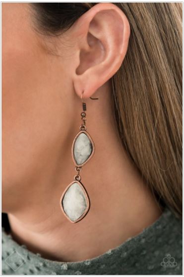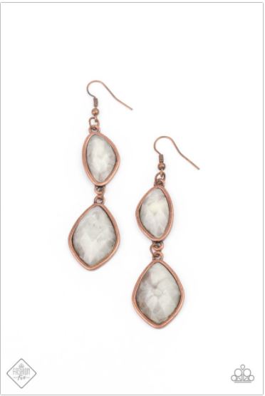 Featuring dramatically faceted surfaces, cloudy faux stone beads are pressed into rustic copper frames that link into a whimsically refined lure. Earring attaches to a standard fishhook fitting.