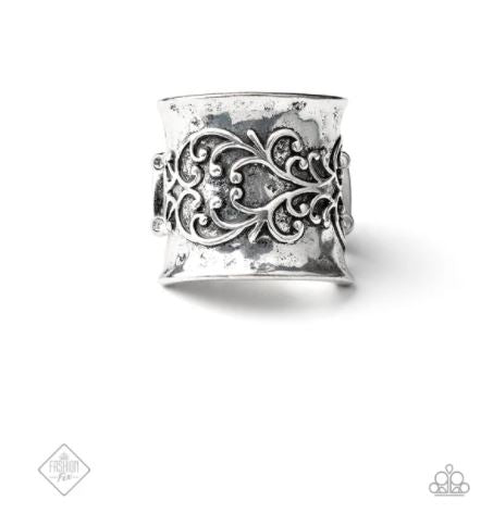 Vine-like silver filigree scrolls across the front of a wide silver band, creating a vintage inspired centerpiece. Features a stretchy band for a flexible fit.