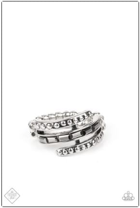 Two studded silver bars flank a dainty row of emerald cut hematite rhinestones, creating the illusion of a stack of wraparound bands that make a lasting impression. Features a dainty stretchy band for a flexible fit.