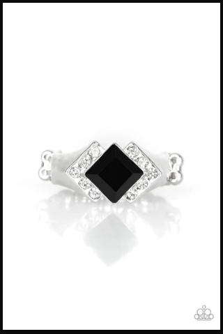 Featuring a regal square cut, a glittery black rhinestone sits atop a bold silver band dusted in sparkling white rhinestones for a refined flair. Features a dainty stretchy band for a flexible fit.